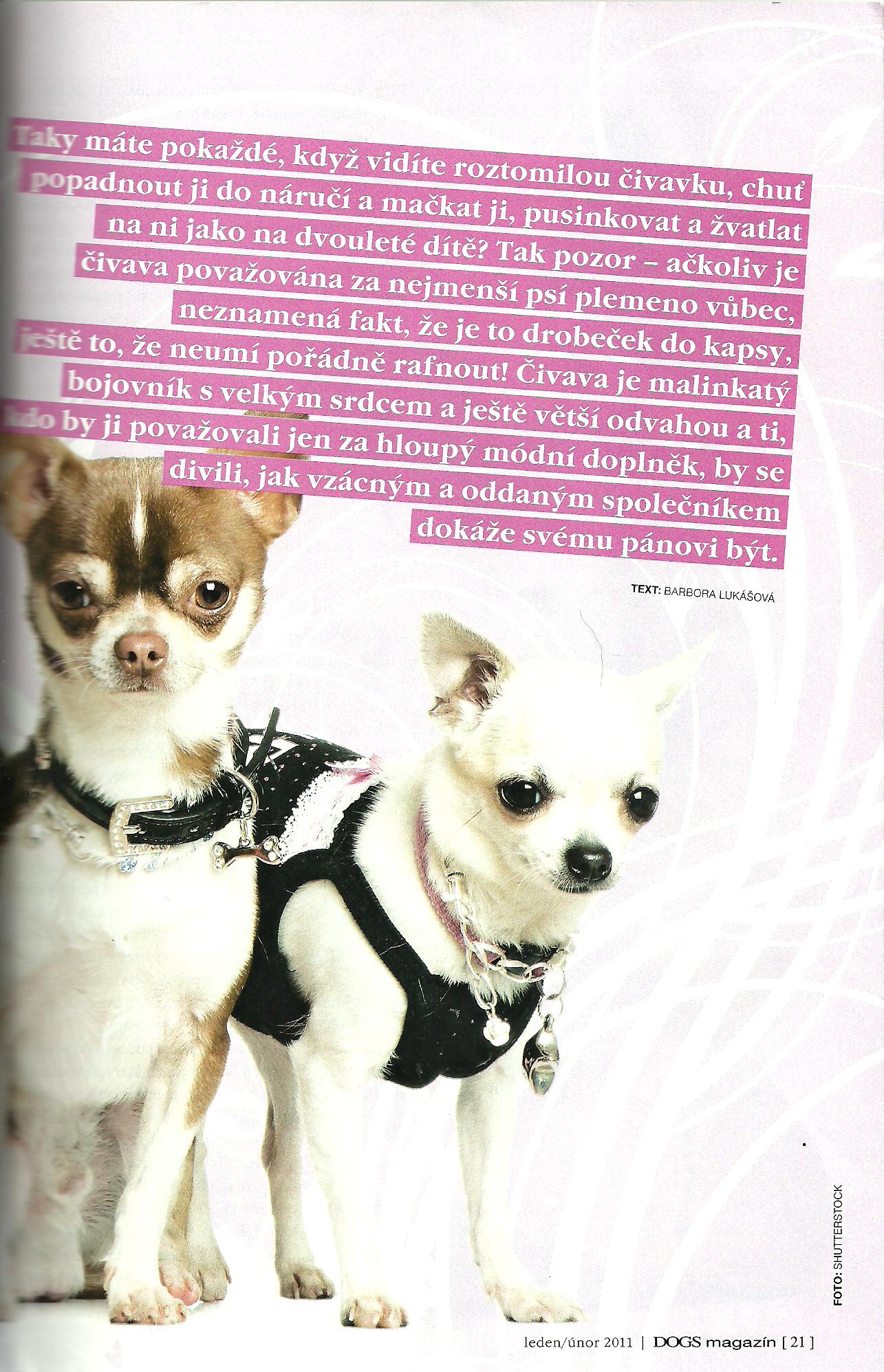 KRÁTKÝ HISTORICKÝ PŘEHLED: | Čivava je nejmenším plemenem psů na světě a nese název největší provincie republiky Mexiko (Chihuahua). Předpokládá se, že tito psi tam dříve žili volně a v době existence civilizace Toltéků byli domorodci chytáni a domestikováni. Vyobrazení trpasličího psa, který se nazýval »Techichi« a žil v Tule, bylo použito na dekoraci městské architektury; tyto malé sošky se velmi podobají dnešním čivavám. |
